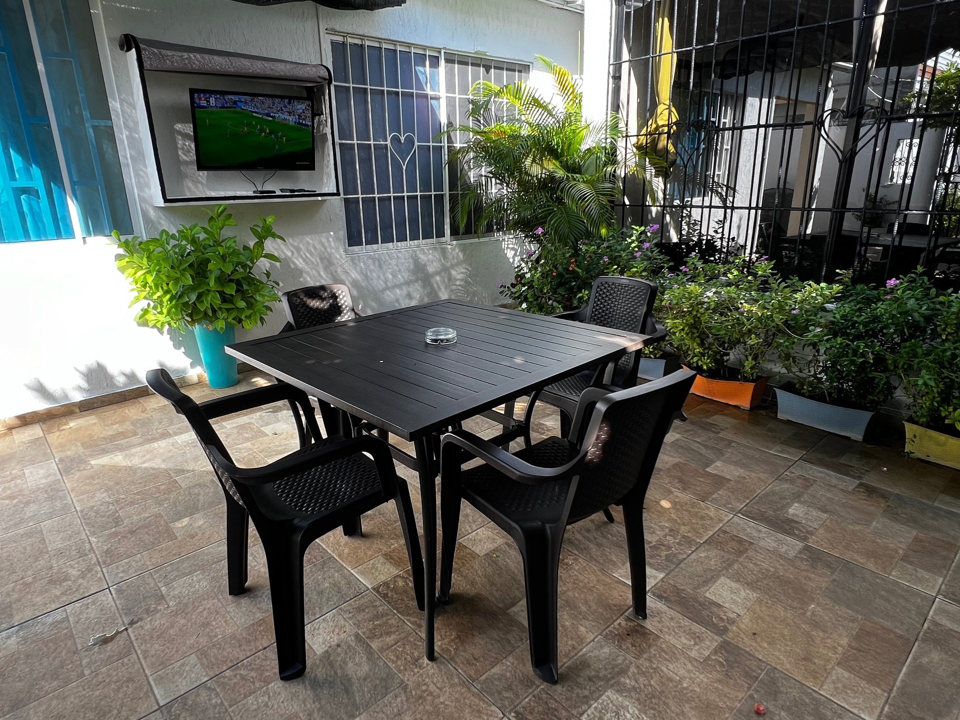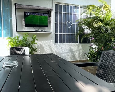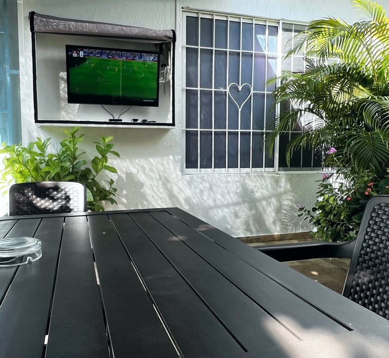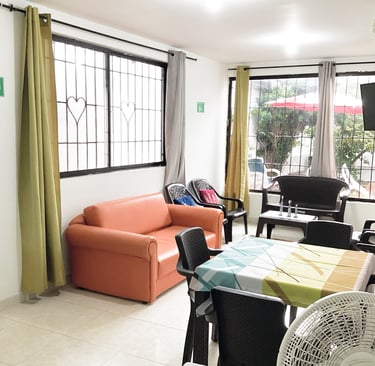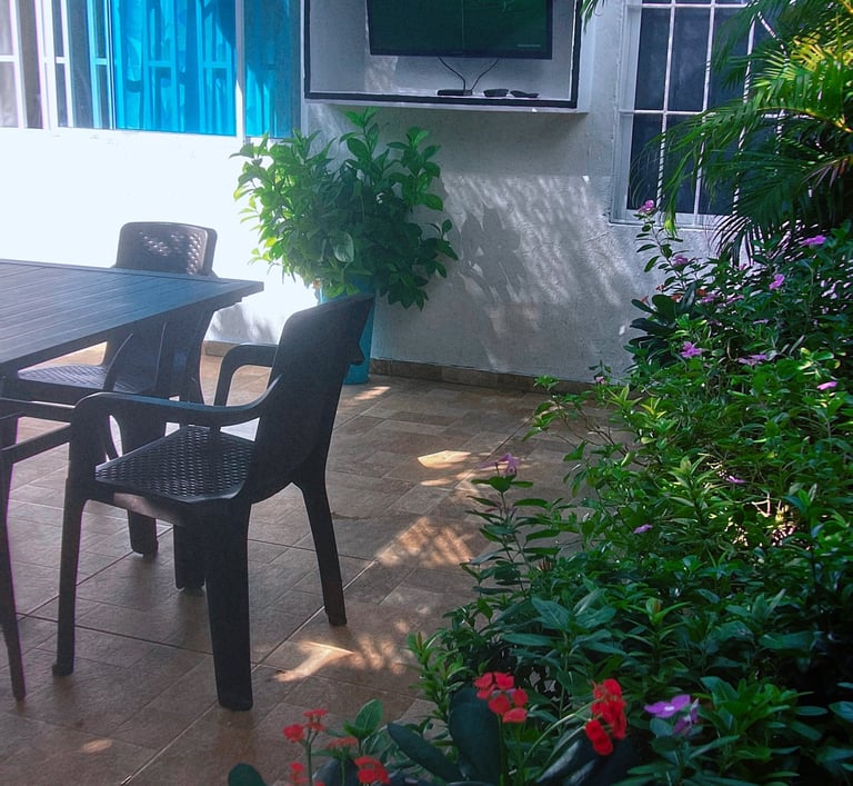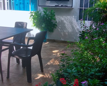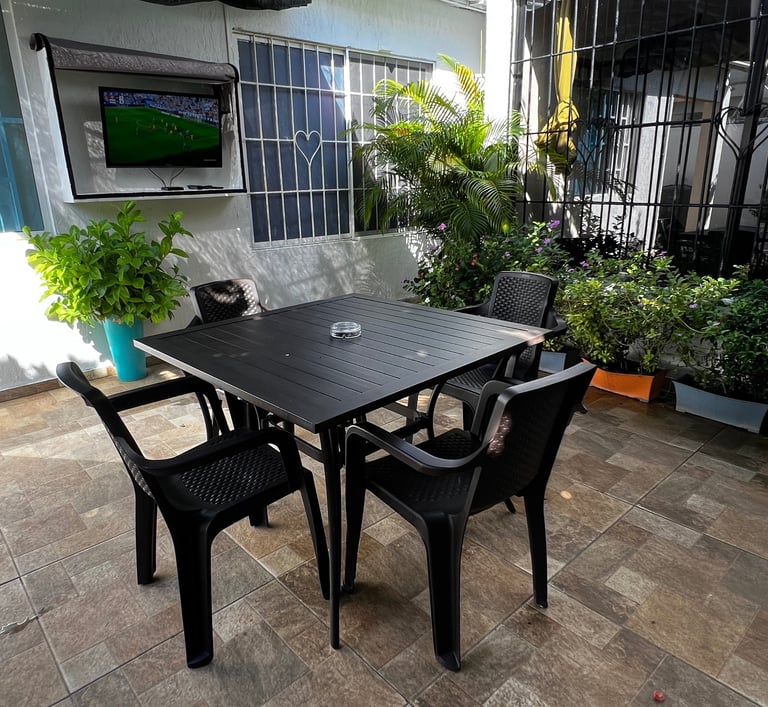 Nuestros huéspedes tienen acceso al jardín que es compartida solamente con el Anfitrión. En el jardín contamos con sillas, mesa, asador de parrilla y también asador a Barril. Igualmente contamos con un televisor de 32" con acceso a canales y portafolio de películas, parqueadero de motos totalmente gratis en este espacio.